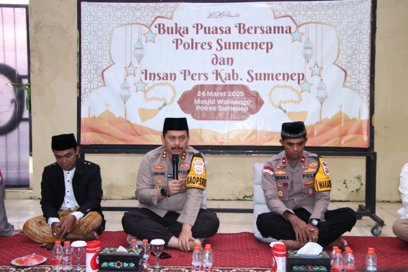SUMENEP, (TrendiKabar.com) – Kapolres Sumenep, AKBP Henri Noveri Santoso, menggelar buka puasa bersama insan pers sebagai bentuk mempererat silaturahmi dan sinergitas antara kepolisian dan media, Senin (24/3/2025). Acara berlangsung di Masjid Wali Songo, Polres Sumenep, Jalan Urip Sumoharjo, Kabupaten Sumenep.