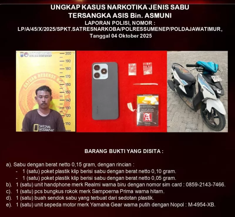 Kasi Humas Polres Sumenep, AKP Widiarti, menjelaskan bahwa pelaku diamankan bersama sejumlah barang bukti sabu siap edar yang disembunyikan di bungkus rokok dan di balik silikon handphone.